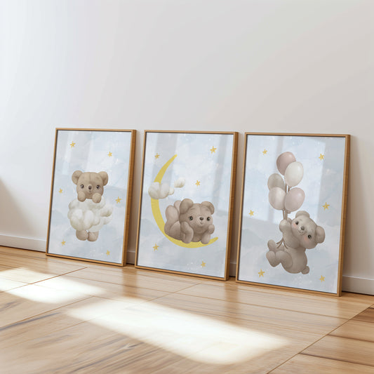Celestial Teddy Dreams: Nursery Wall Art Set with Moon, Clouds & Balloons, Set of 3, N105