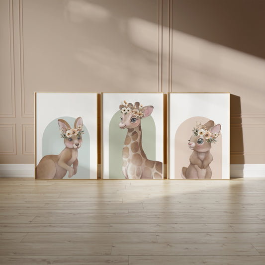 Boho Animal Charm: Giraffe & Bunny Nursery Art, Set of 3, N122