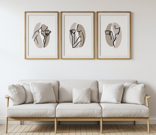Line Art Coffee Aesthetic - Neutral Toned Trio for Contemporary Spaces, Set of 3, D099