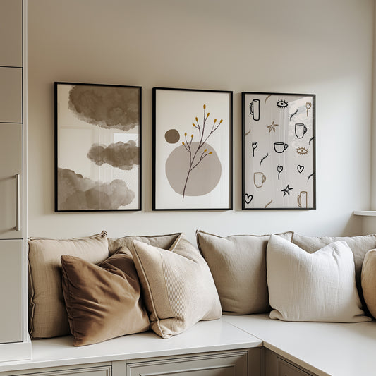 Minimalist Neutral Poster Set: Cloudy Dreams & Simple Symbols, Set of 3, D107