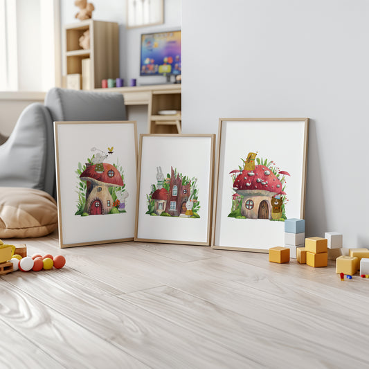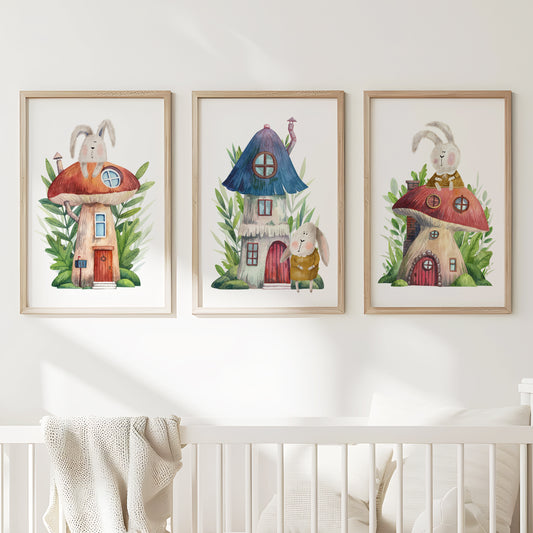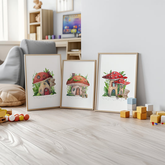 Enchanted Mushroom Hideaway - Whimsical Forest Animal Home Wall Art, Set of 3, N160