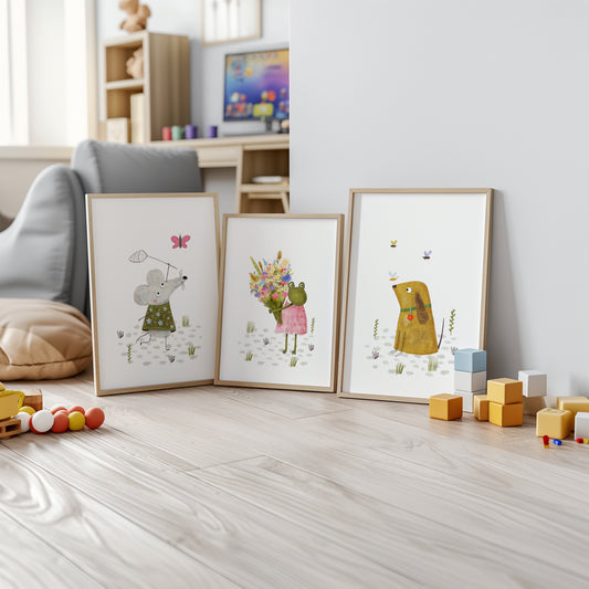 Charming Forest Companions Wall Art - Mouse, Frog, and Dog, Set of 3, N152