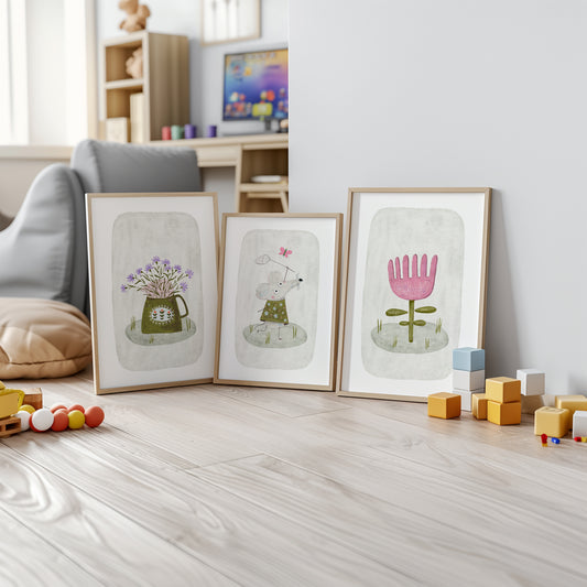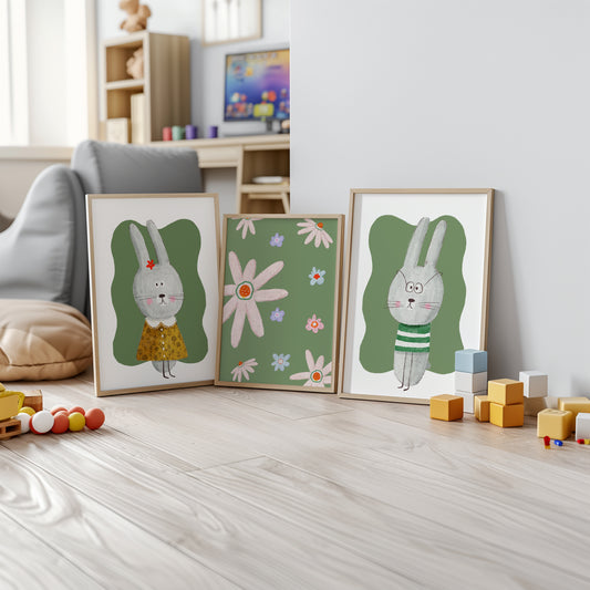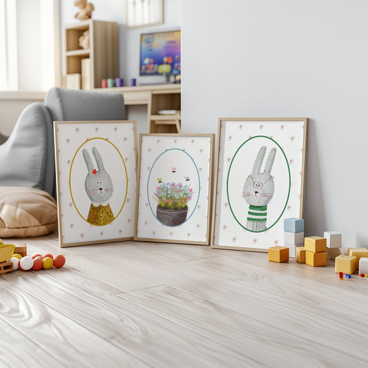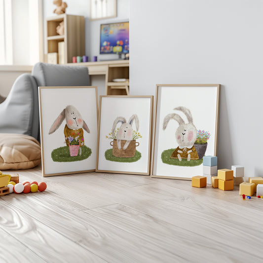 Floral Bunny Charm - Cute Kids' Room Poster Set, Set of 3, N156