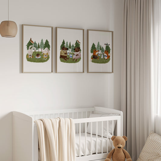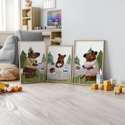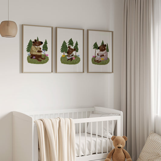 Bear Family Picnic: Forest Tales for Kids' Room Decor, Set of 3, N166