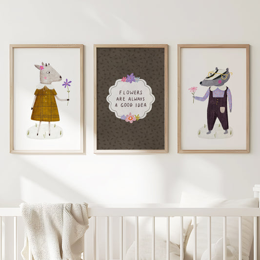 Forest Daydreams: The Flower Whisperers (Nature-themed animal friends for magical kids’ rooms.), Set of 3, N172