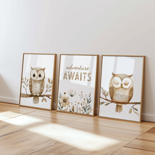 Woodland Owl Adventure Set – “Adventure Awaits” Nursery Art Trio, Set of 3, N082
