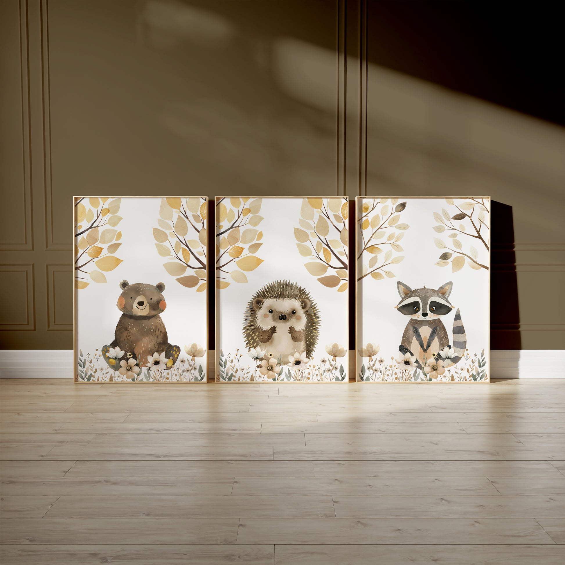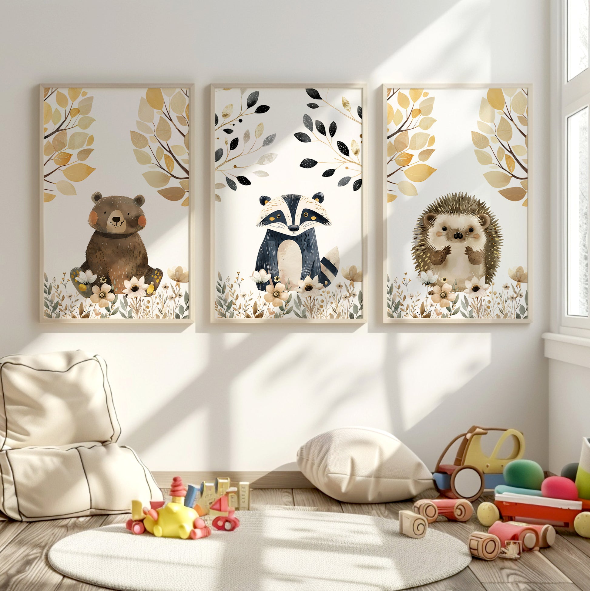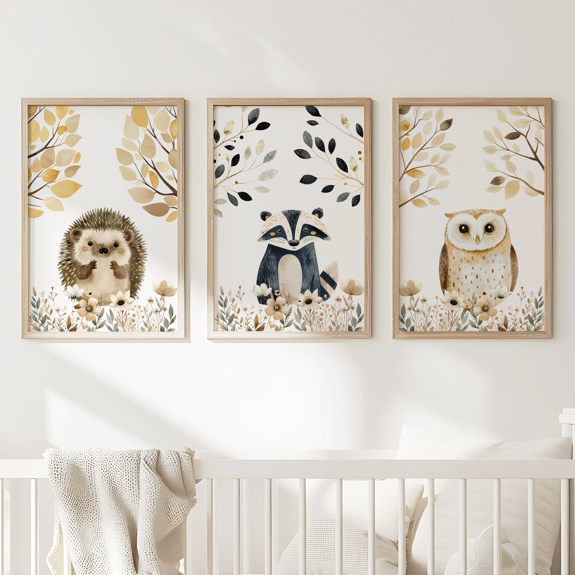 Bring the enchantment of the forest to your nursery with these adorable woodland animal prints. Each poster features a delightful character—an inquisitive owl, a sweet hedgehog, and a curious raccoon—amidst a backdrop of gentle florals and autumnal leaves. The soft color palette and delicate details make these prints the perfect addition to create a warm and inviting space for your little adventurer.