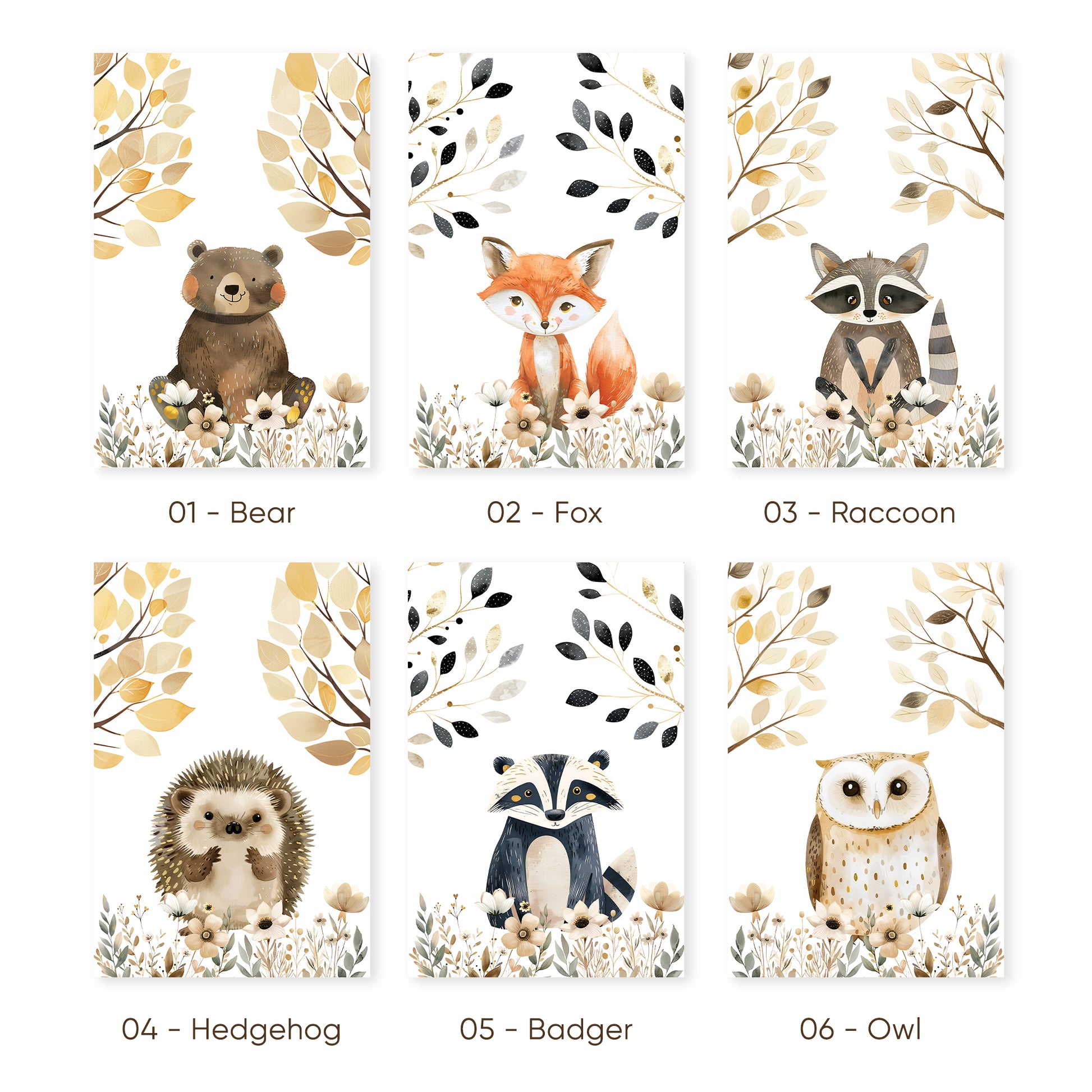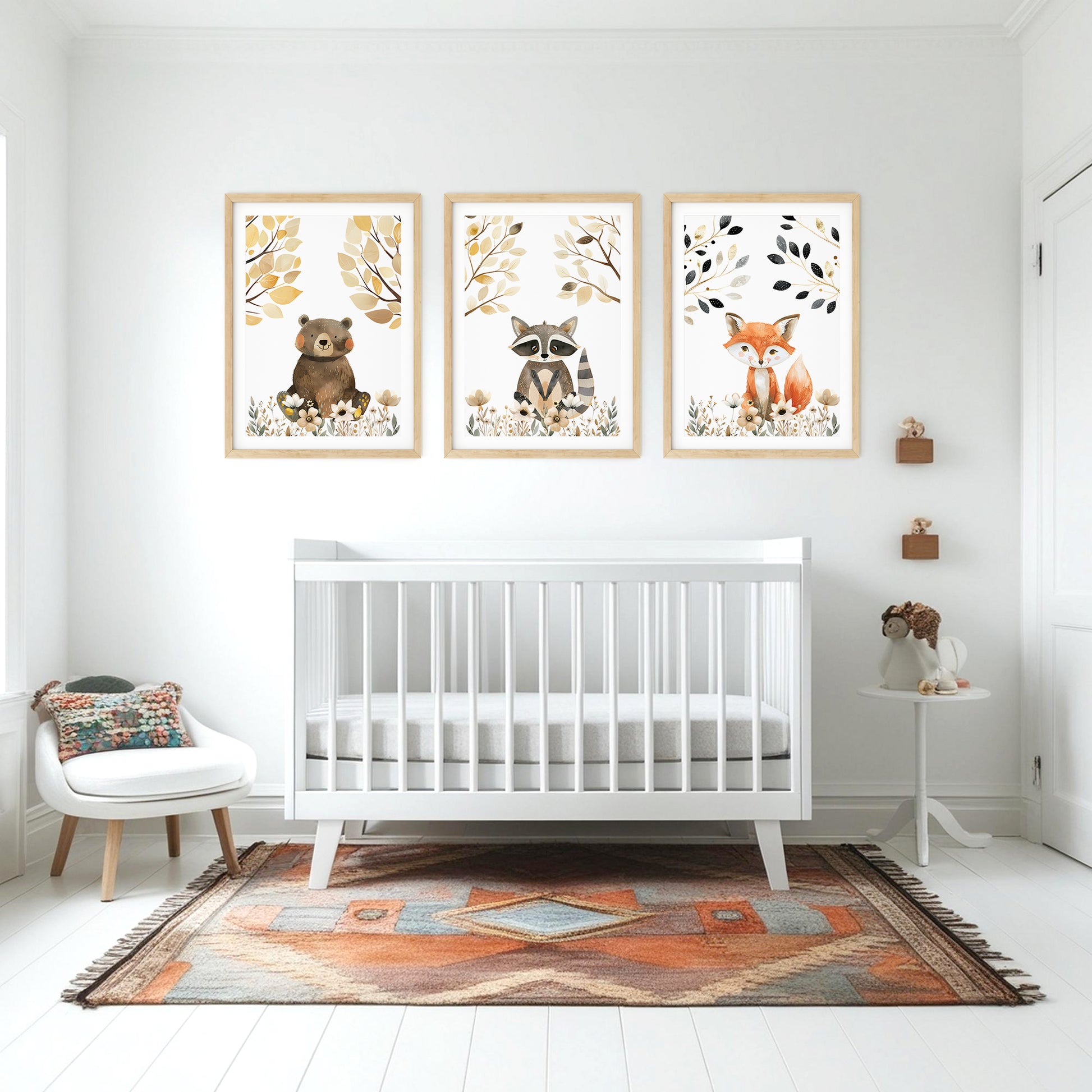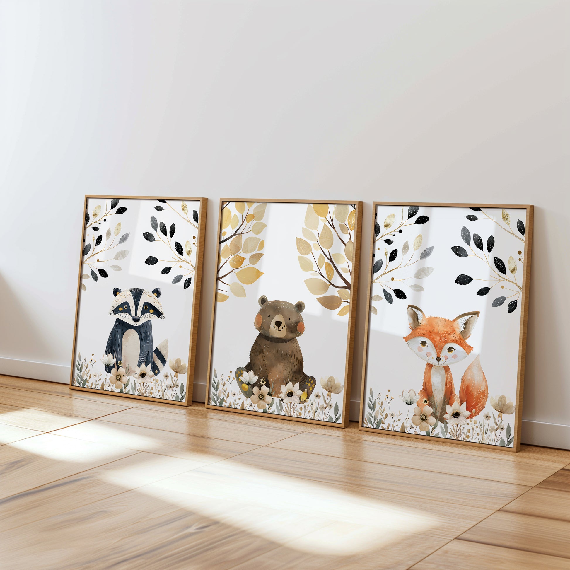 Bring the enchantment of the forest to your nursery with these adorable woodland animal prints. Each poster features a delightful character—an inquisitive owl, a sweet hedgehog, and a curious raccoon—amidst a backdrop of gentle florals and autumnal leaves. The soft color palette and delicate details make these prints the perfect addition to create a warm and inviting space for your little adventurer.