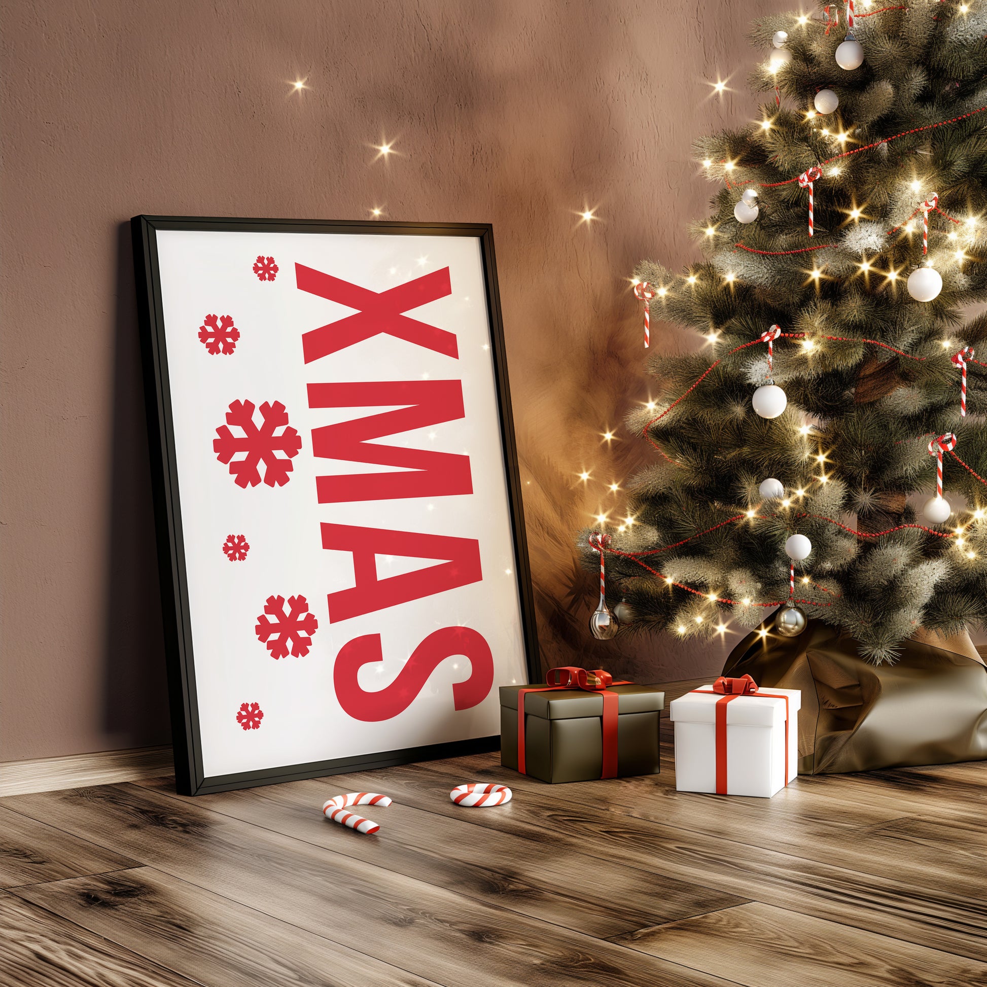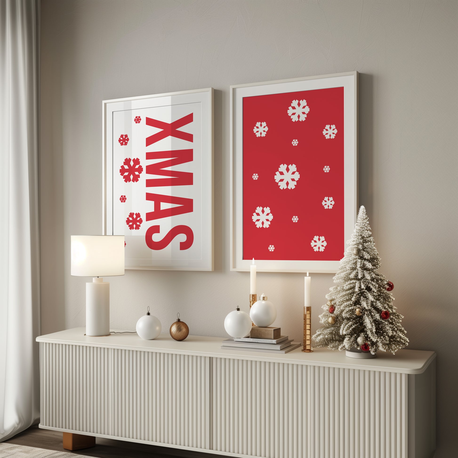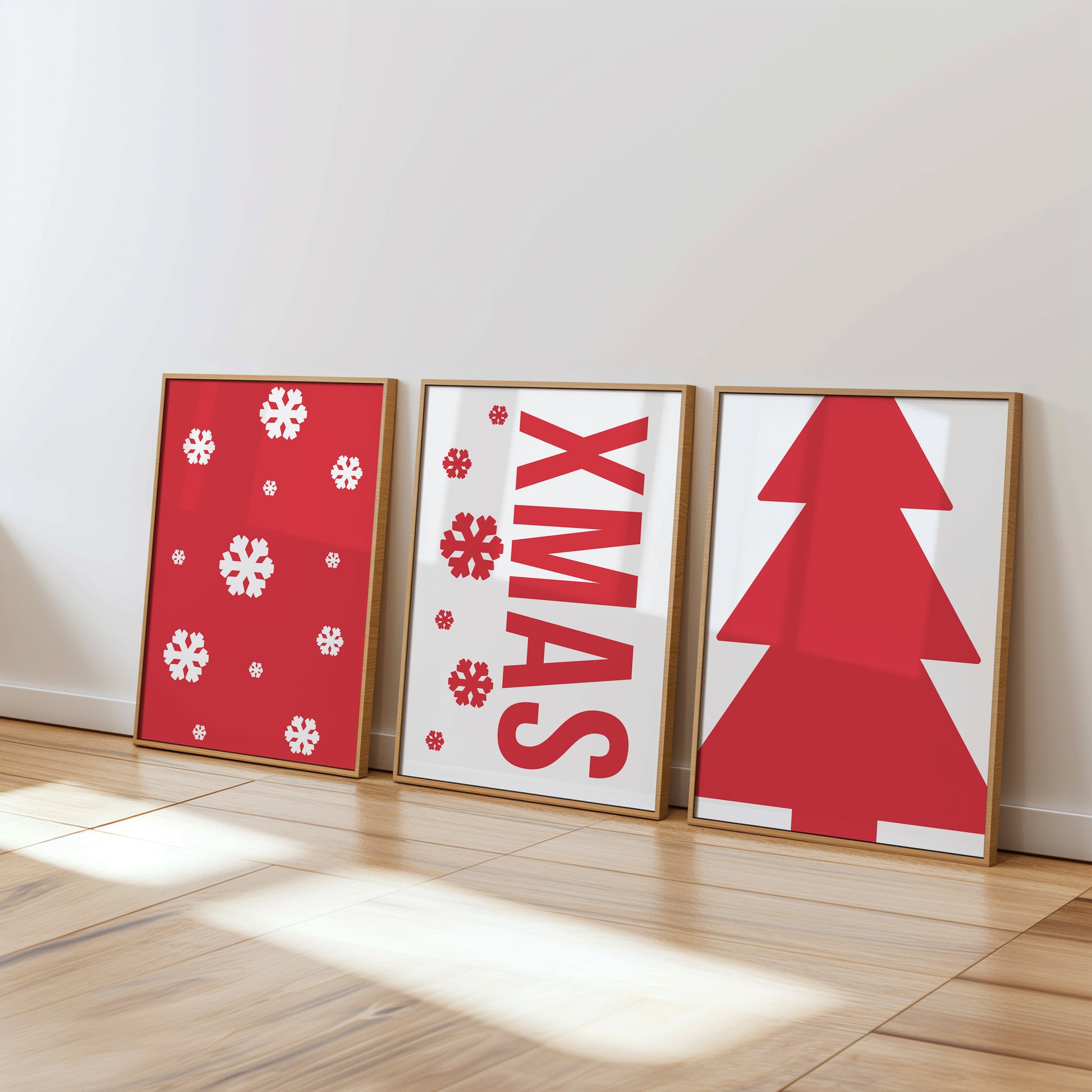 Transform your living space into a festive haven with this holiday poster set. Featuring a vibrant red color palette, the snowflake design adds a touch of whimsy, the 'XMAS' typography makes a bold statement, and the abstract Christmas tree anchors the trio with its timeless charm. An elegant way to celebrate the most wonderful time of the year!