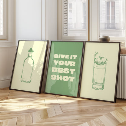 Celebrate the art of mixing drinks and good times with these stunning wall prints. Featuring a minimalist tequila bottle, a sleek lime-garnished shot glass, and a motivational centerpiece, this set is designed to make your bar area a true conversation starter. Let the bold green and cream tones elevate your space!
