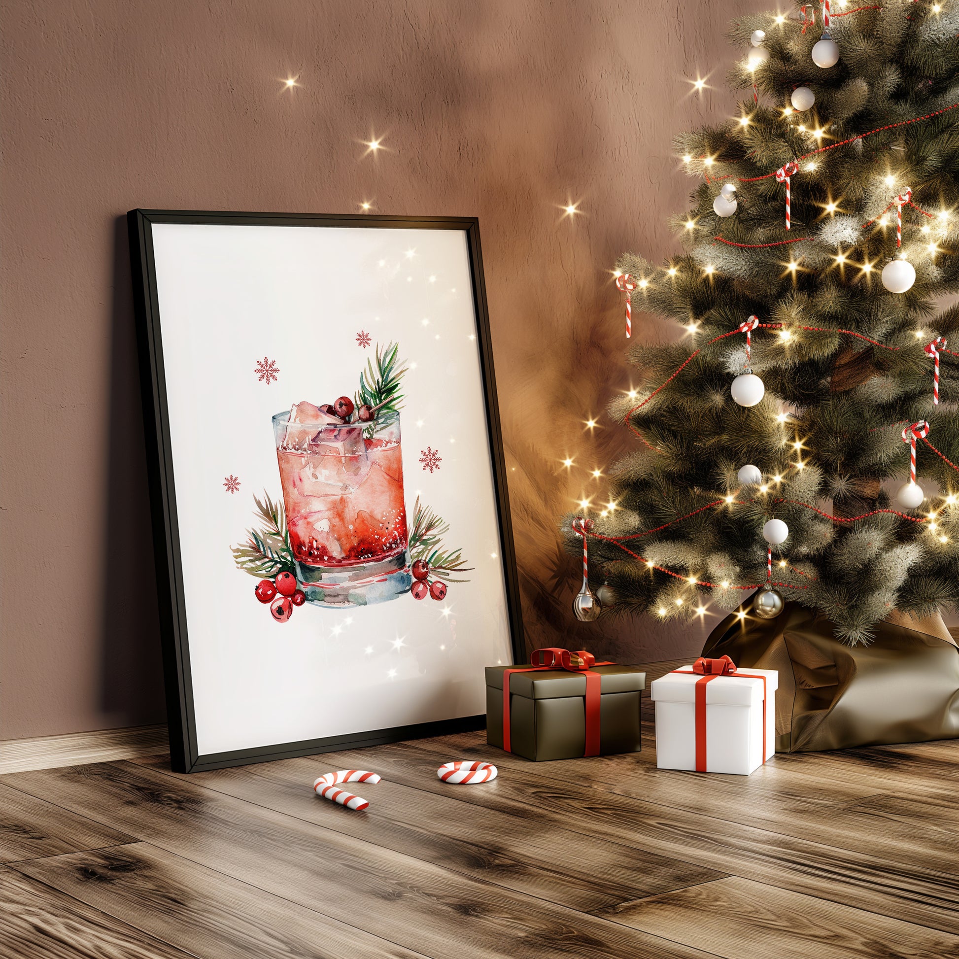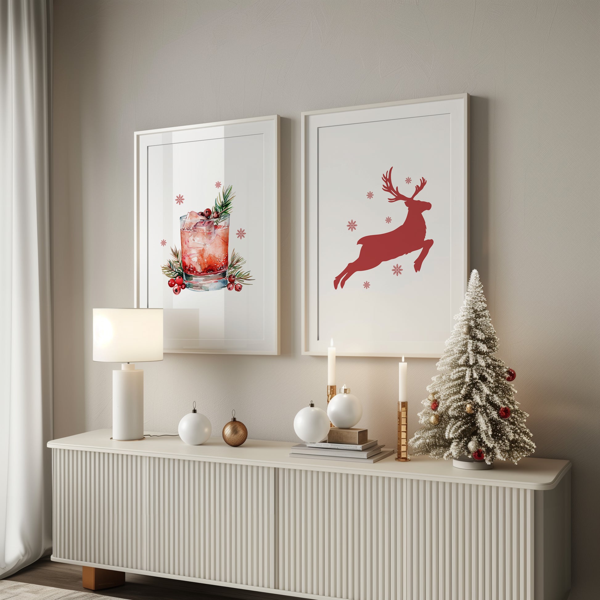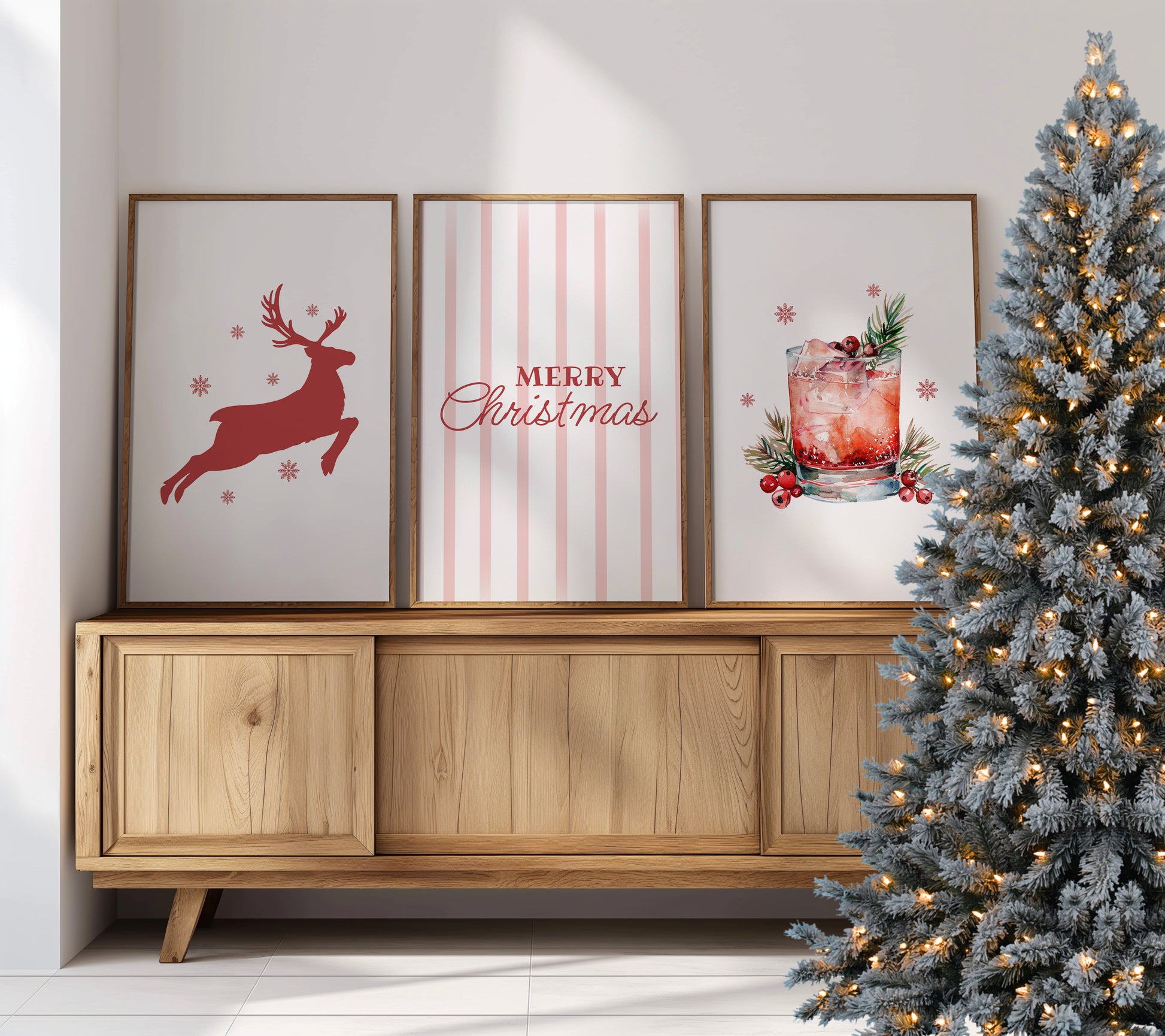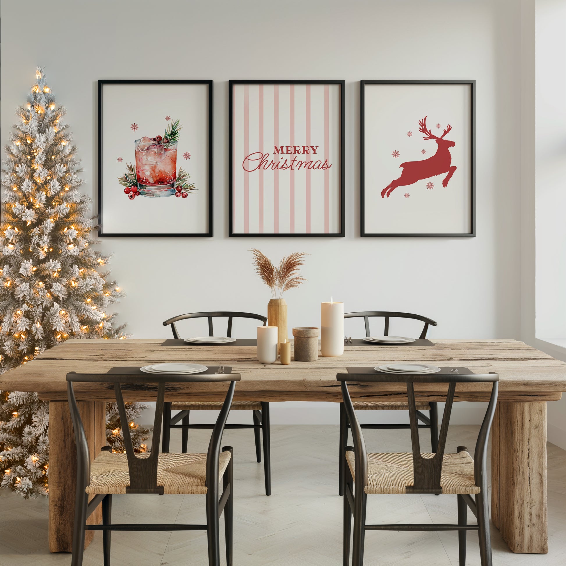 Transform your living space into a holiday haven with this festive wall decor set. The vibrant red reindeer captures the magic of winter nights, the "Merry Christmas" print adds a heartfelt greeting, and the cranberry cocktail art piece brings a modern twist to seasonal decor.