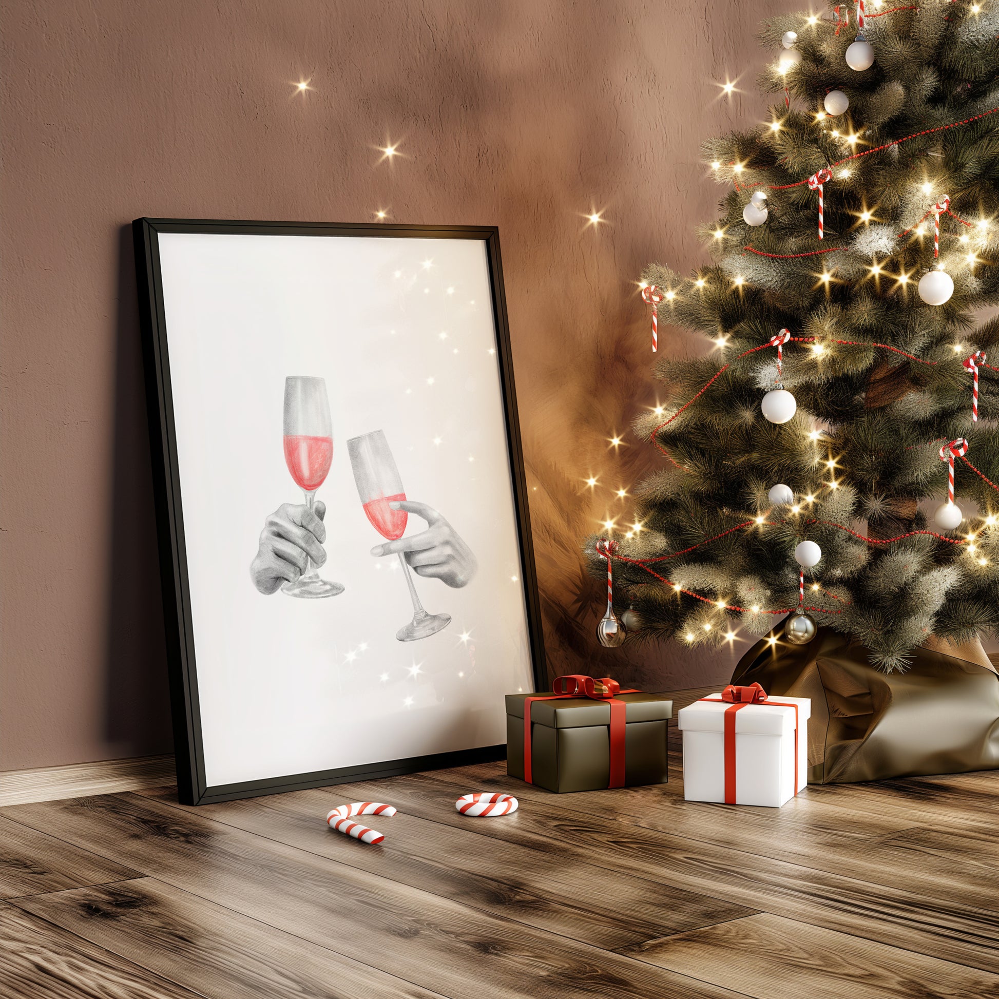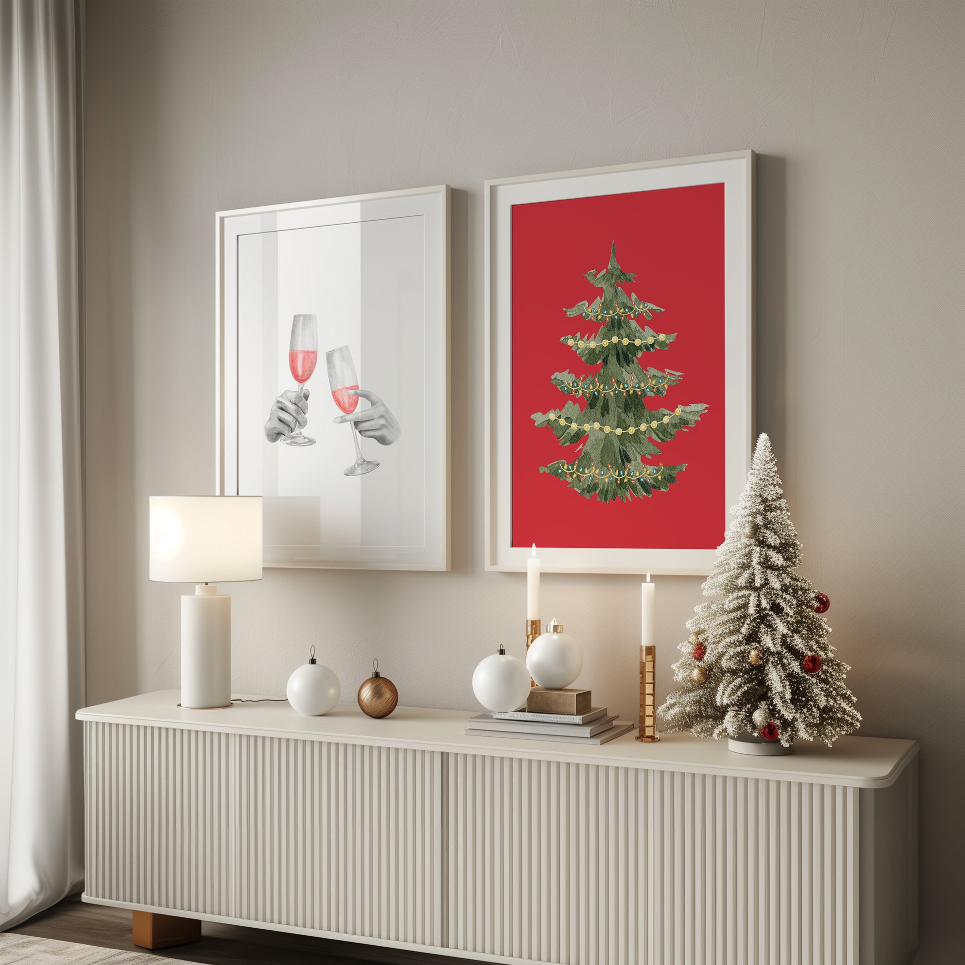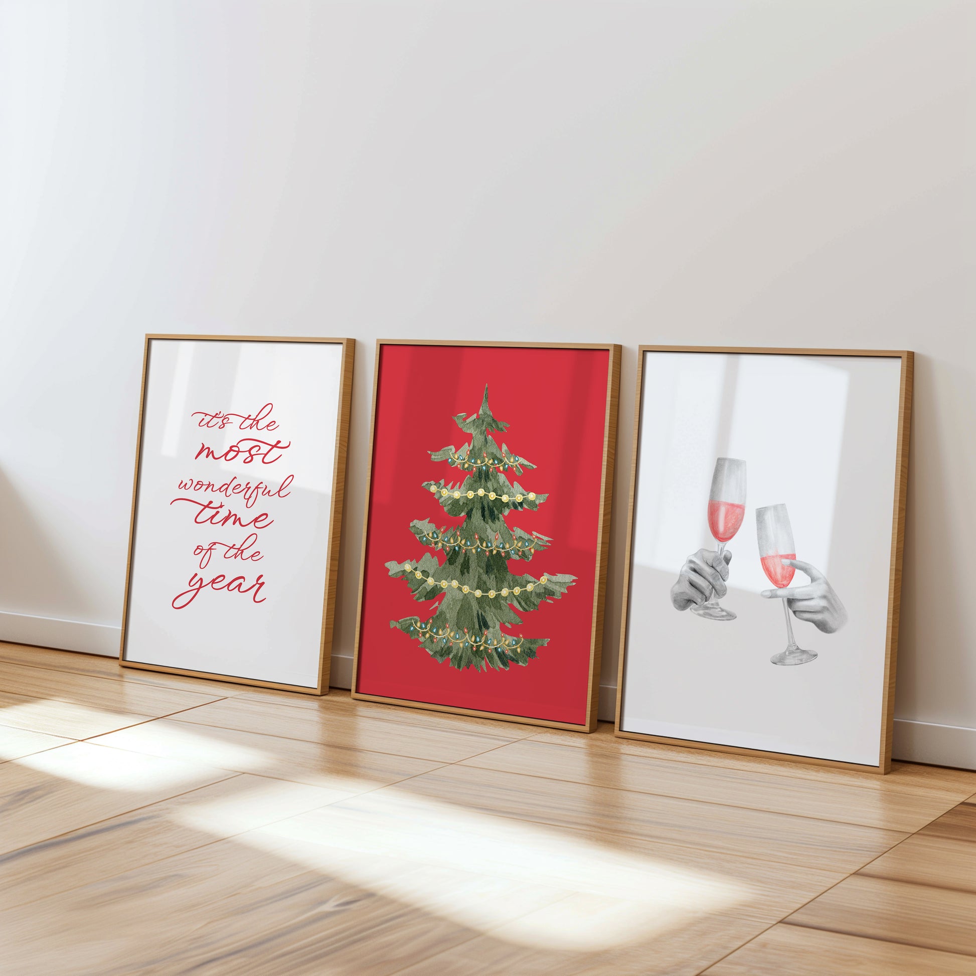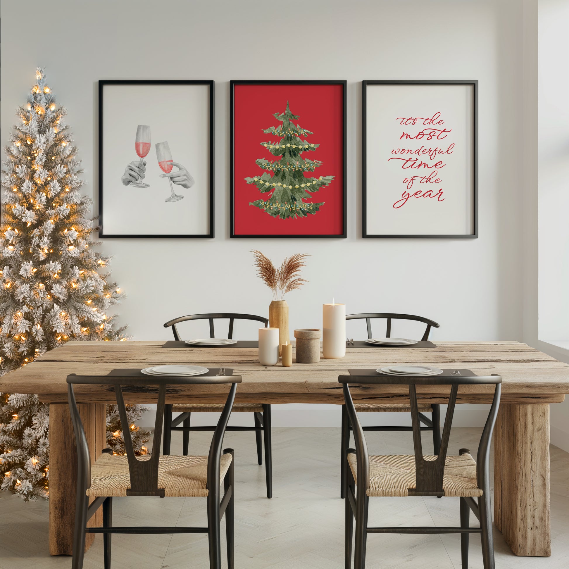 Bring the spirit of the season into your home with our charming holiday poster set. The centerpiece Christmas tree is vibrant and full of character, while the champagne flutes add a touch of celebration. The heartfelt quote completes the collection, making it a perfect holiday decor piece for any room.