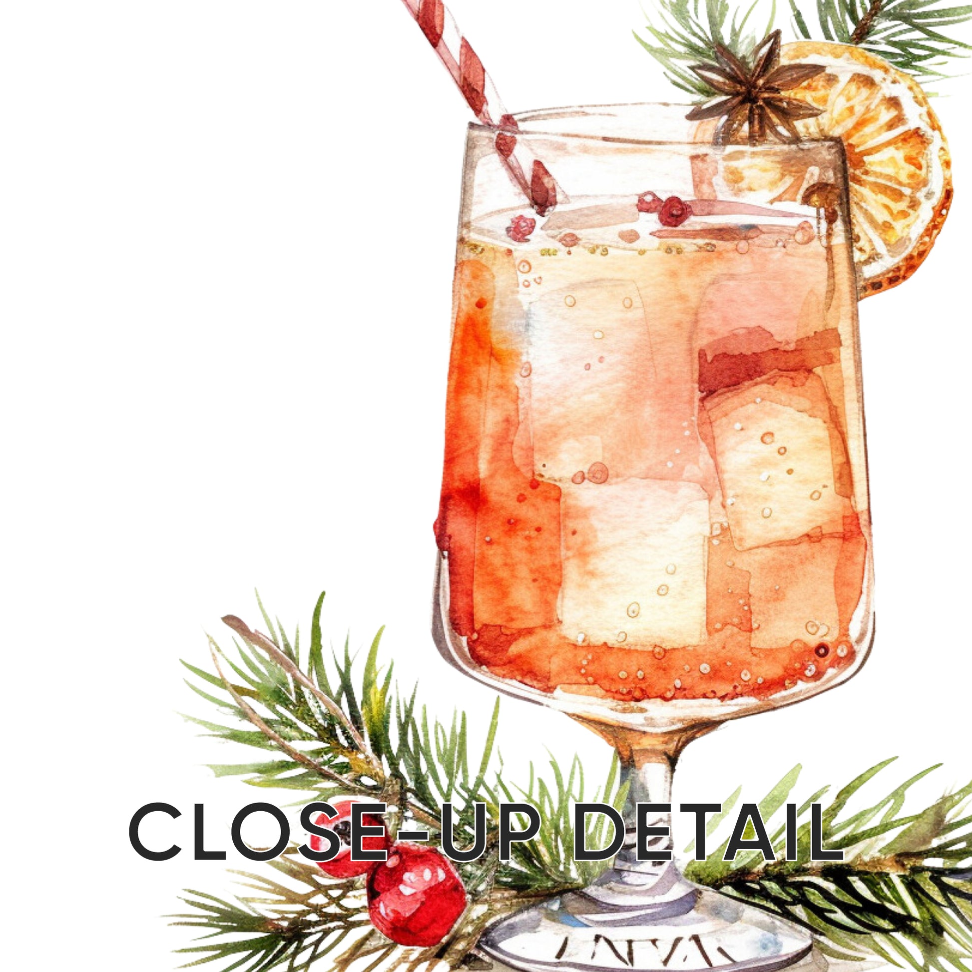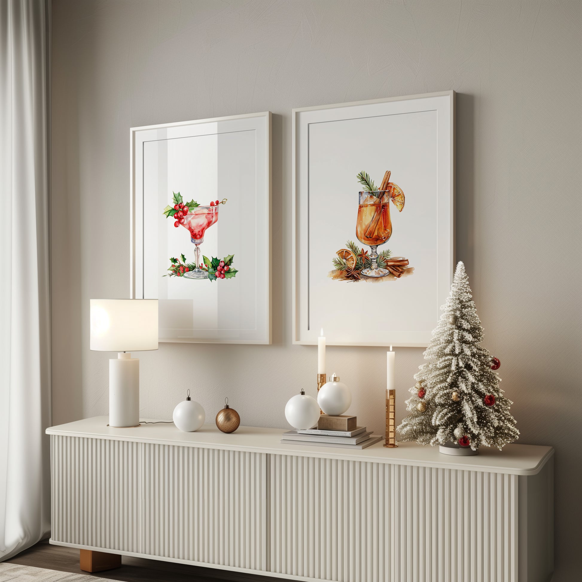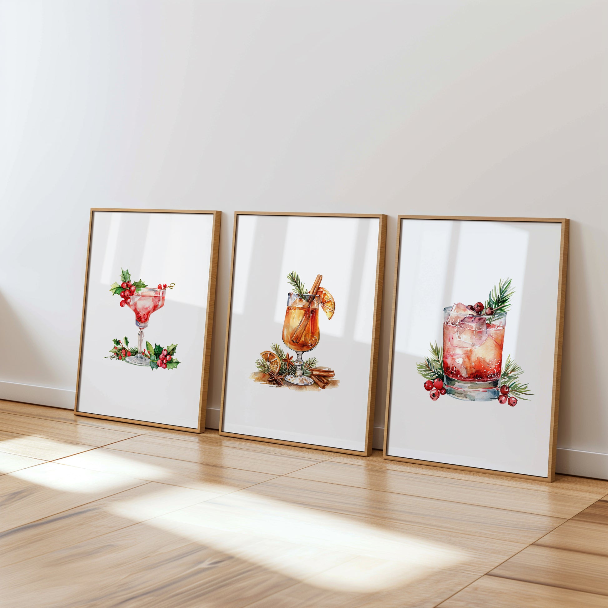 Savor the spirit of the season with this trio of art prints showcasing festive cocktails adorned with Christmas greenery. Each piece tells a story of celebration, from the sparkle of crushed ice to the cozy embrace of cinnamon and citrus. A captivating addition to your holiday ambiance, these prints bring life to walls longing for seasonal charm.