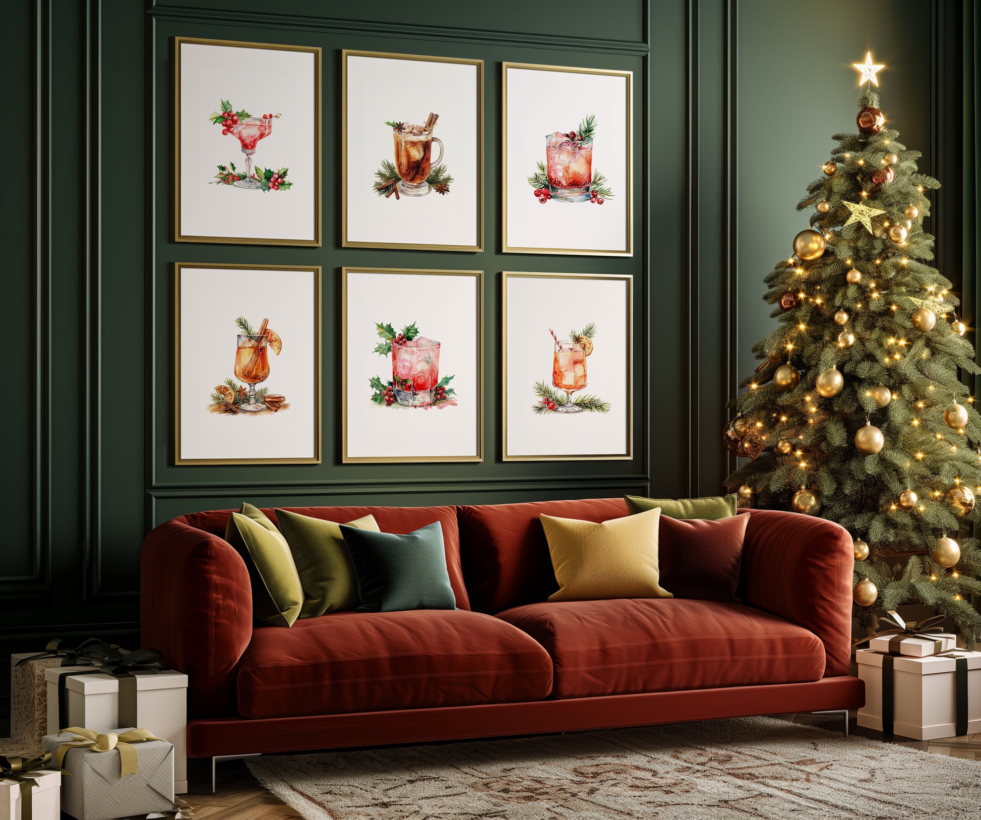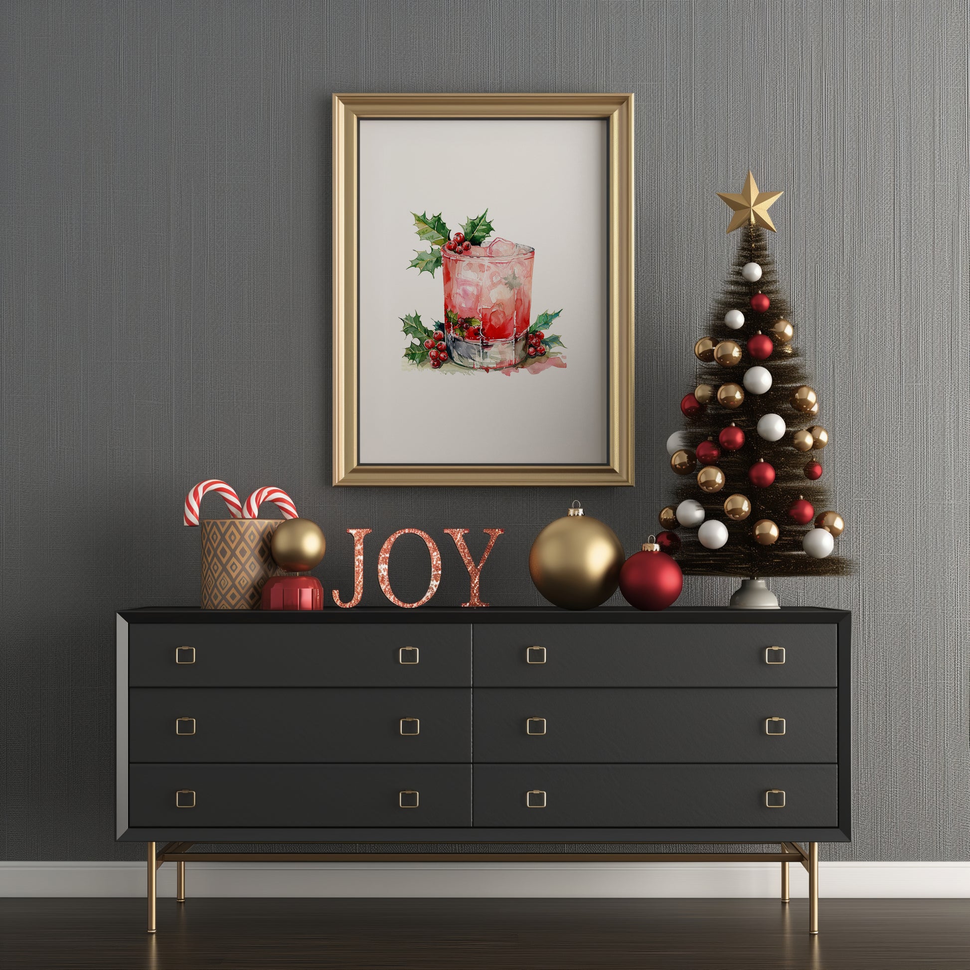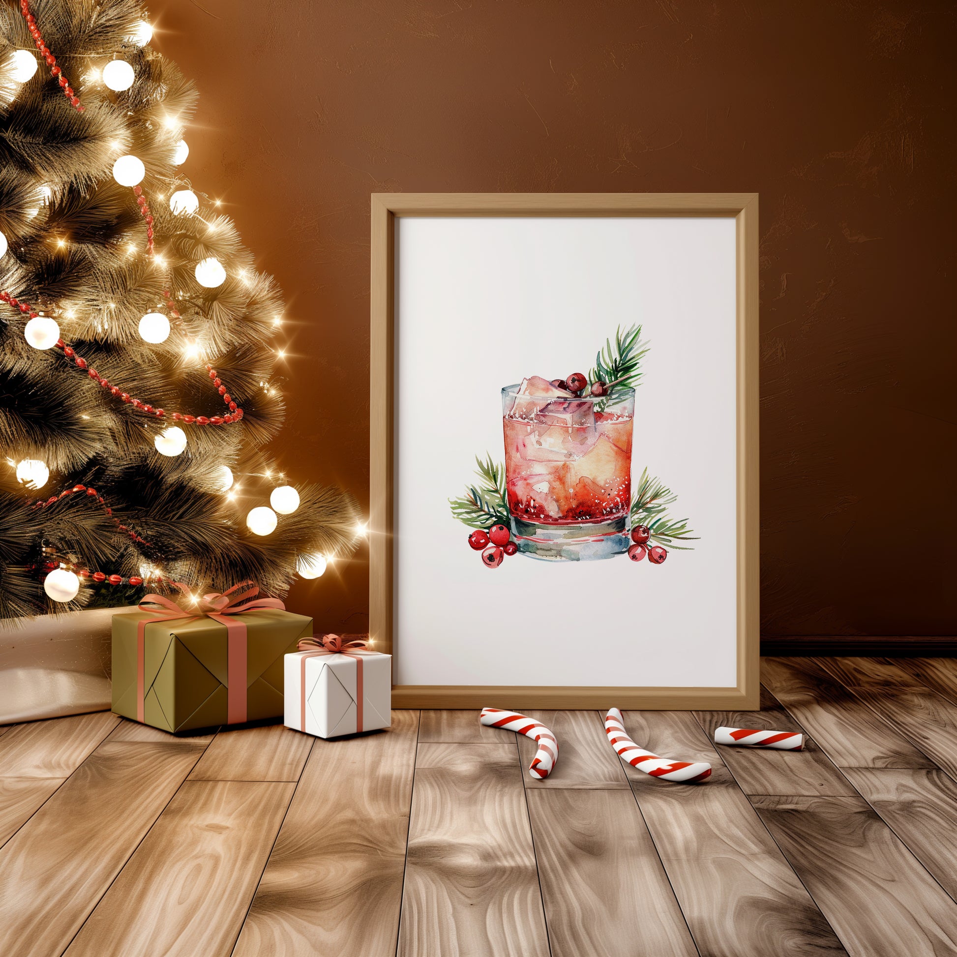 Savor the spirit of the season with this trio of art prints showcasing festive cocktails adorned with Christmas greenery. Each piece tells a story of celebration, from the sparkle of crushed ice to the cozy embrace of cinnamon and citrus. A captivating addition to your holiday ambiance, these prints bring life to walls longing for seasonal charm.
