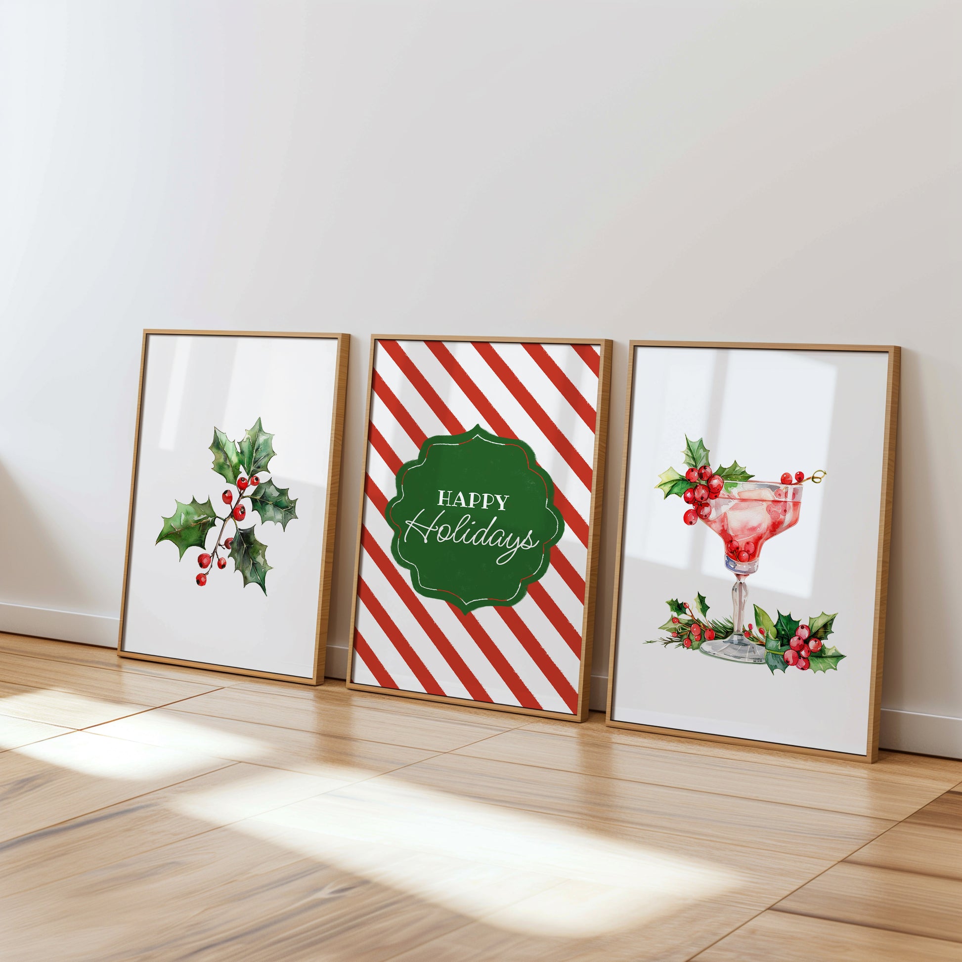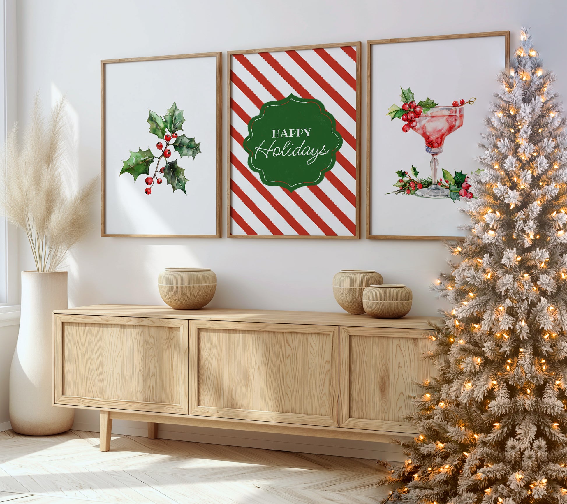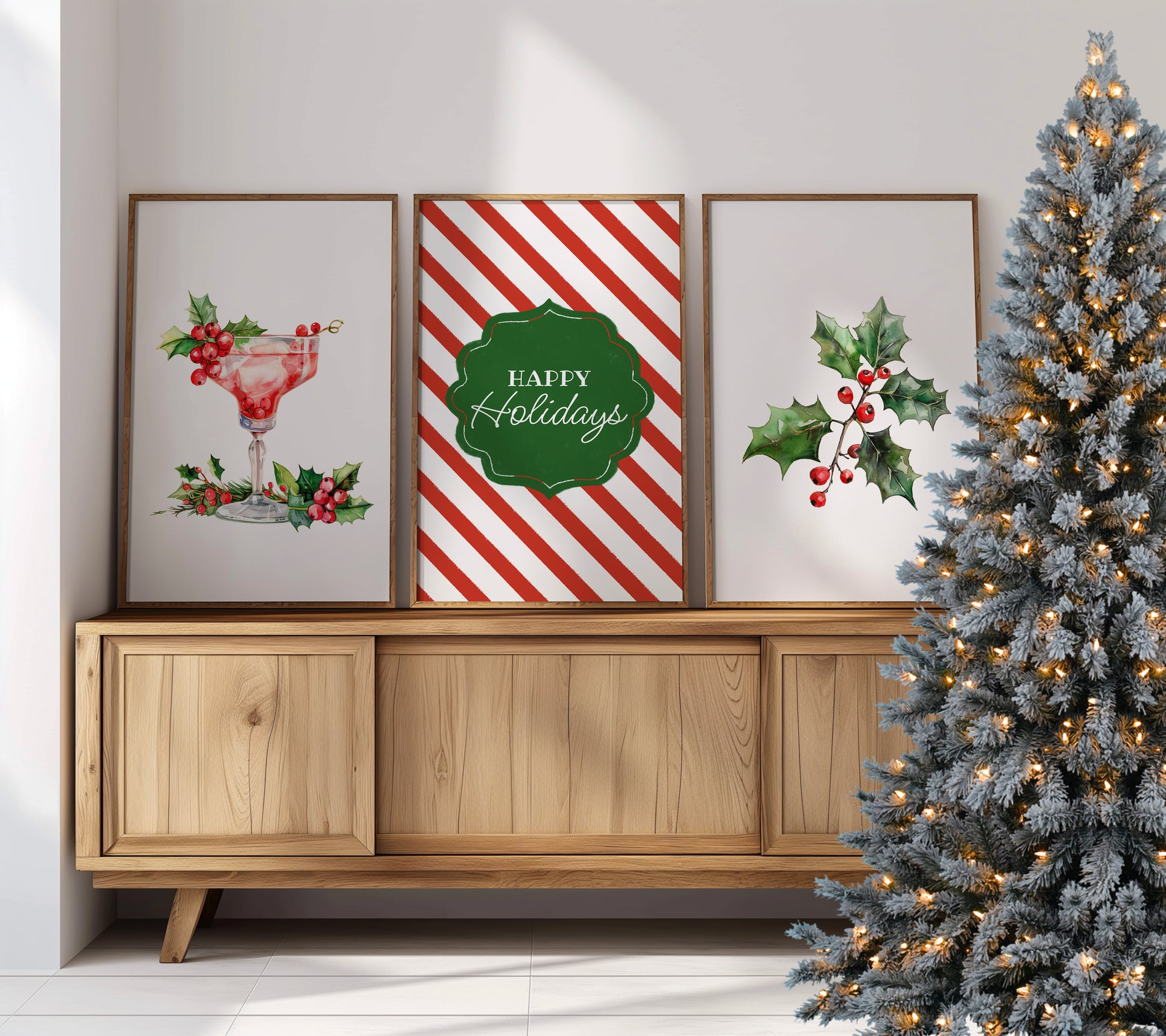 Holly Jolly Cocktail Trio Bring the magic of the holidays to your home with this stunning set of three festive prints. Featuring a vibrant sprig of holly, a celebratory cocktail, and a cheerful “Happy Holidays” message against candy-striped patterns, this trio encapsulates the spirit of joy and celebration. Perfect for sprucing up your dining room or gift-giving.