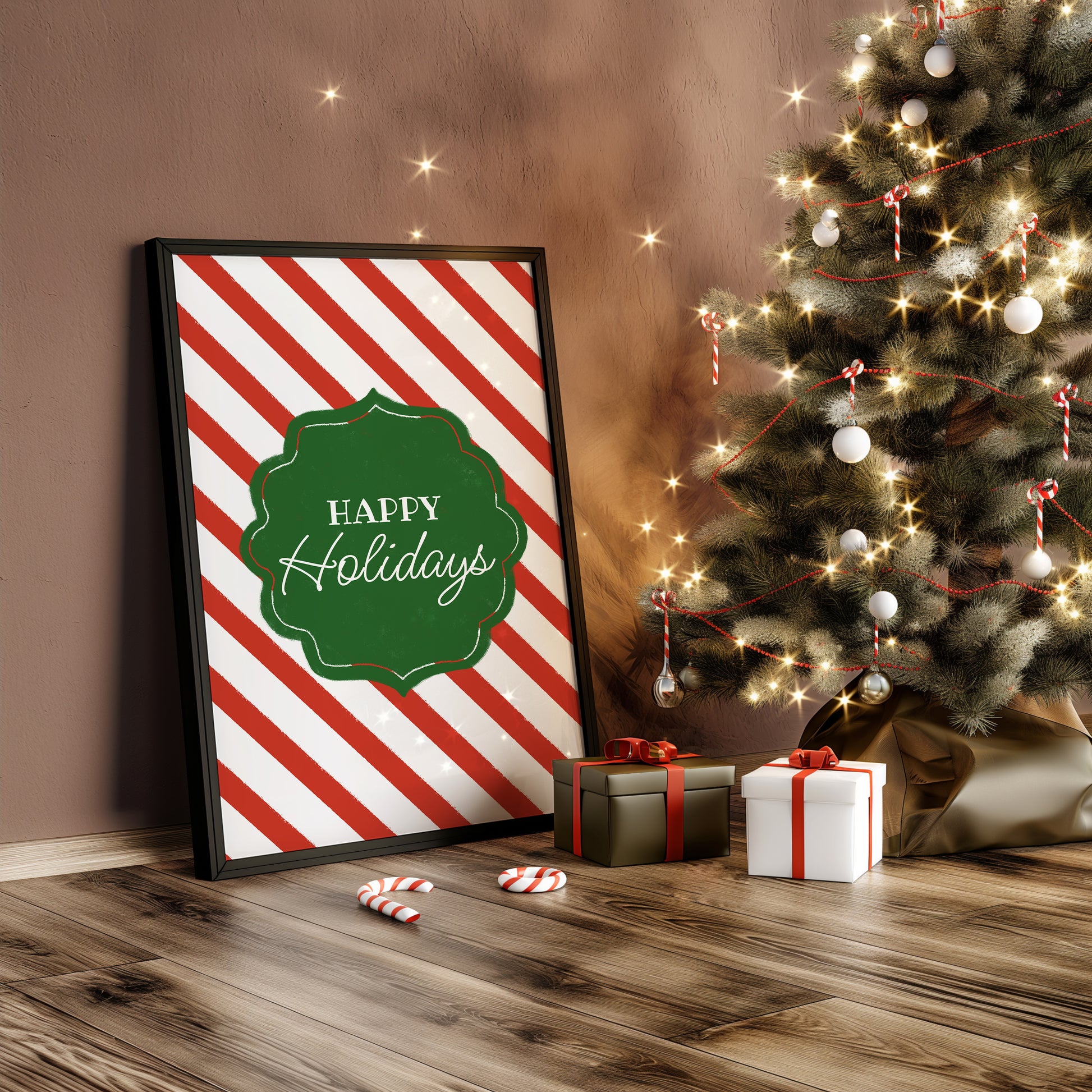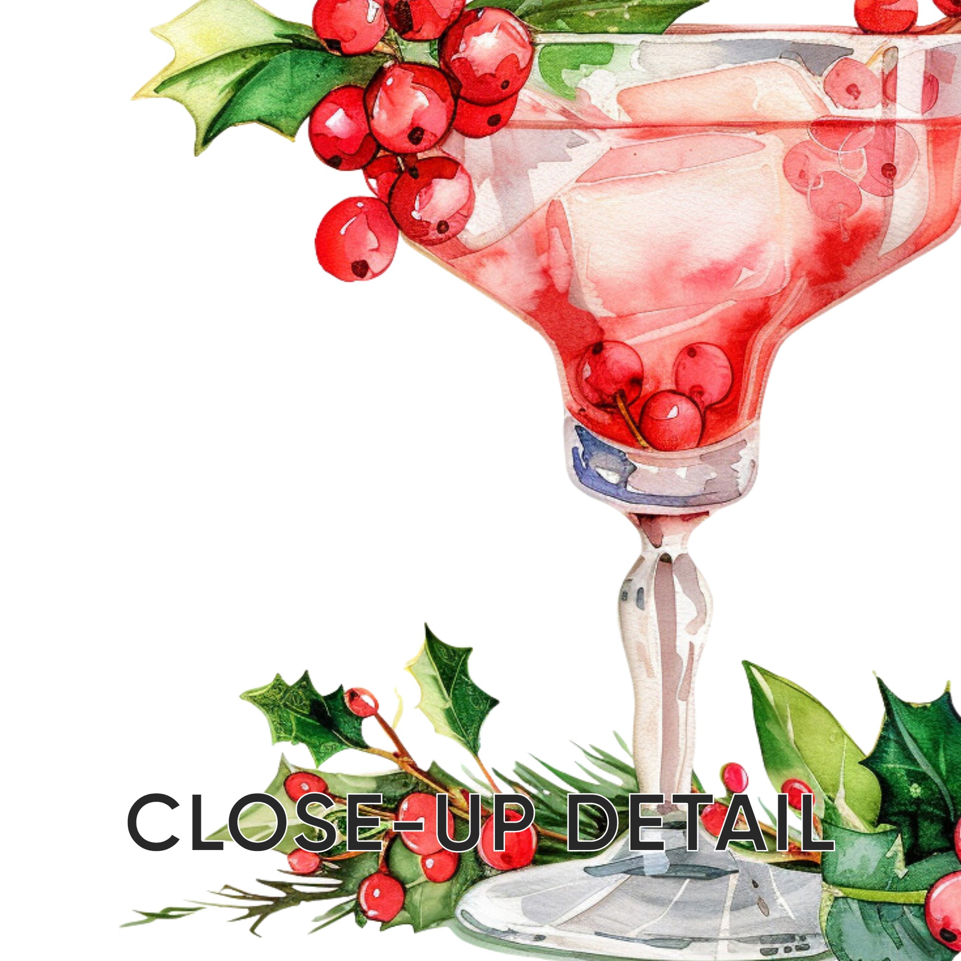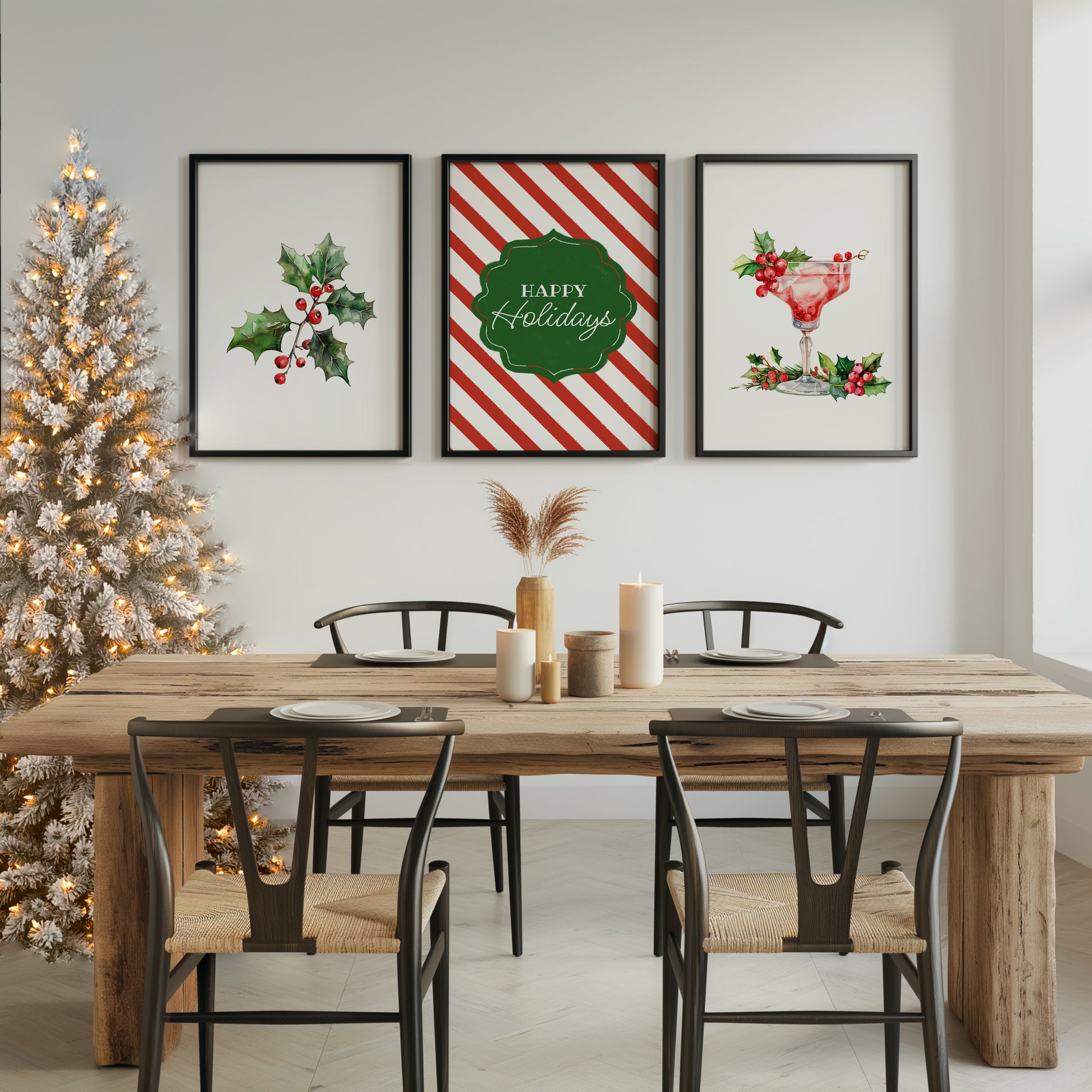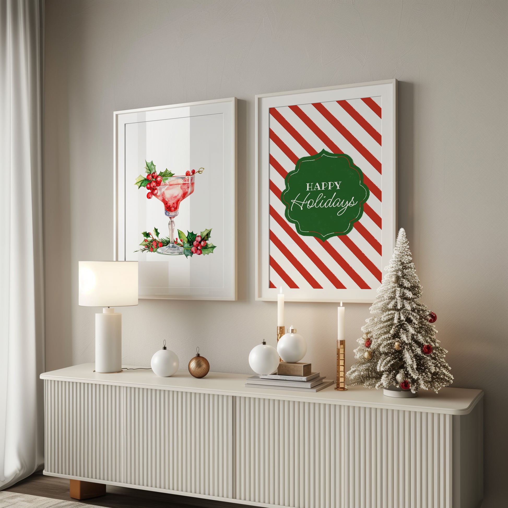 Holly Jolly Cocktail Trio Bring the magic of the holidays to your home with this stunning set of three festive prints. Featuring a vibrant sprig of holly, a celebratory cocktail, and a cheerful “Happy Holidays” message against candy-striped patterns, this trio encapsulates the spirit of joy and celebration. Perfect for sprucing up your dining room or gift-giving.
