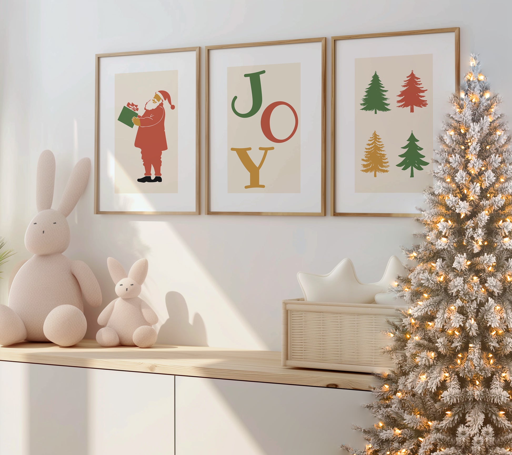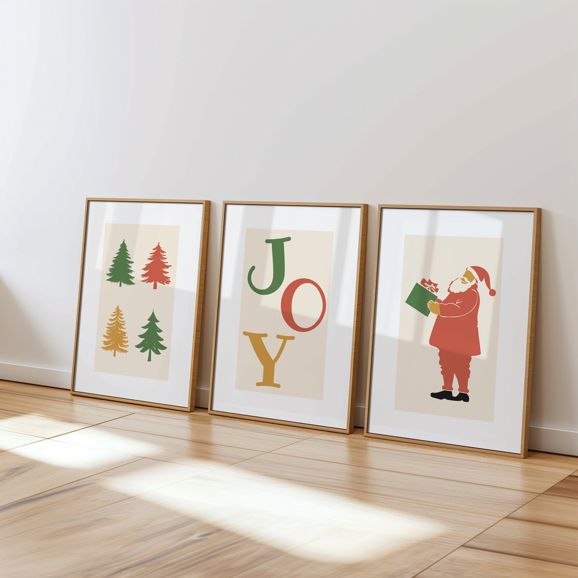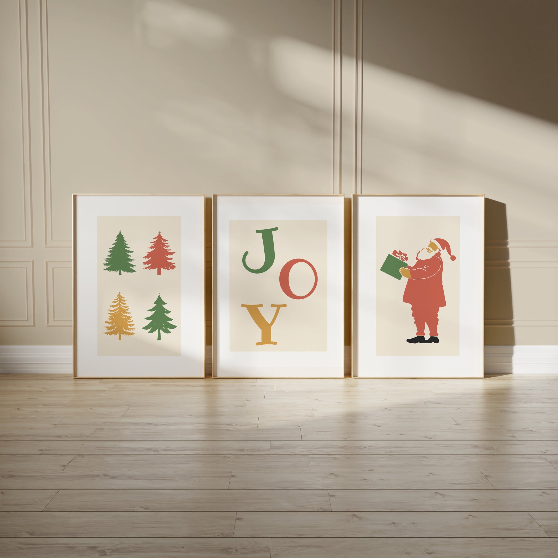 Celebrate the season with elegance and fun through this delightful set of Christmas-themed posters. The clean lines of colorful holiday trees, a bold "JOY" centerpiece, and a cheerful Santa make this set perfect for bringing festive charm to any wall. Designed to spread joy, these prints are a must-have for your holiday decor.