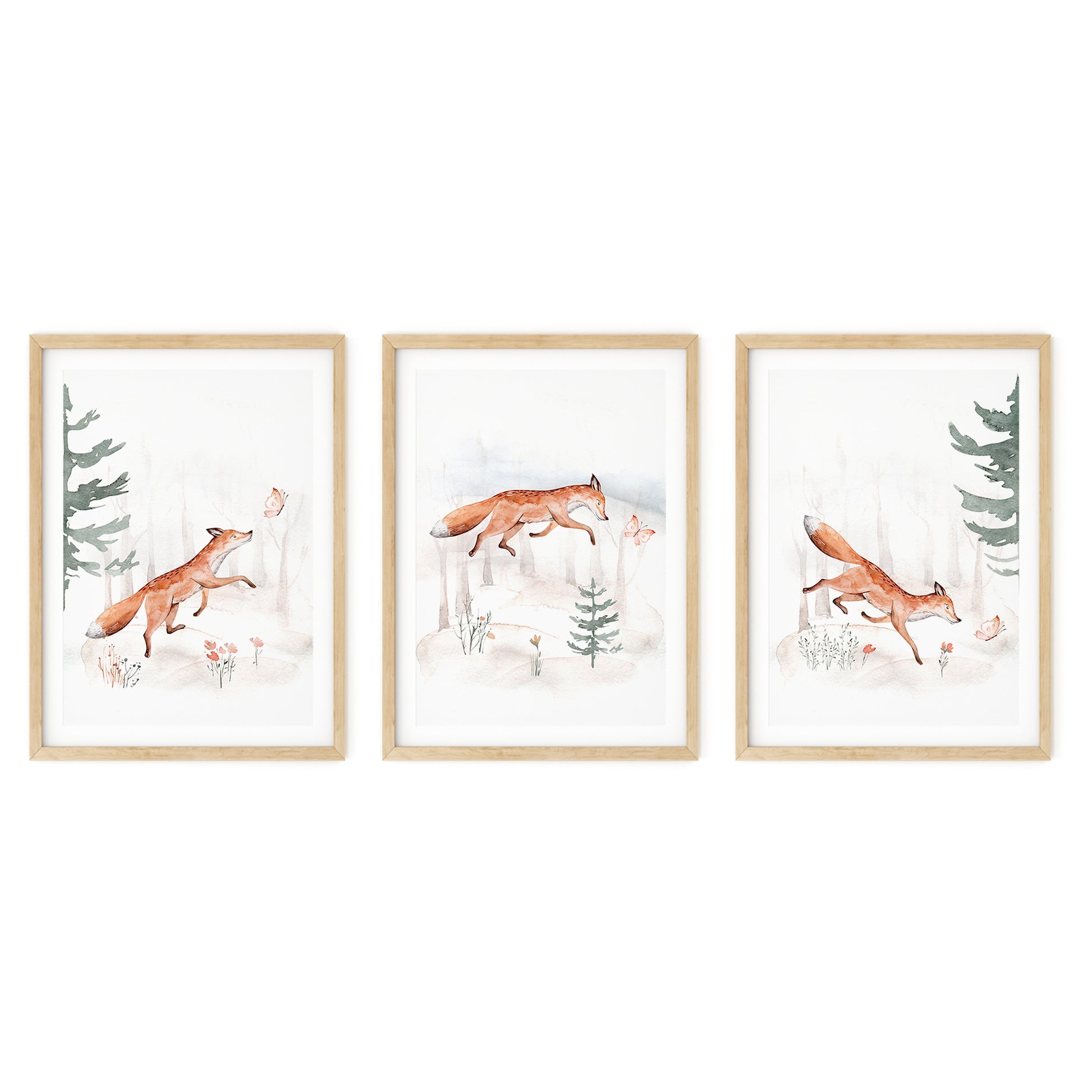 Introduce a sense of adventure to your child's space with these enchanting fox prints. Each artwork captures the lively spirit of foxes as they bound through the forest, interacting with nature’s beauty. The soft earthy colors and delicate details make this trio a perfect fit for a peaceful, yet playful, nursery environment.